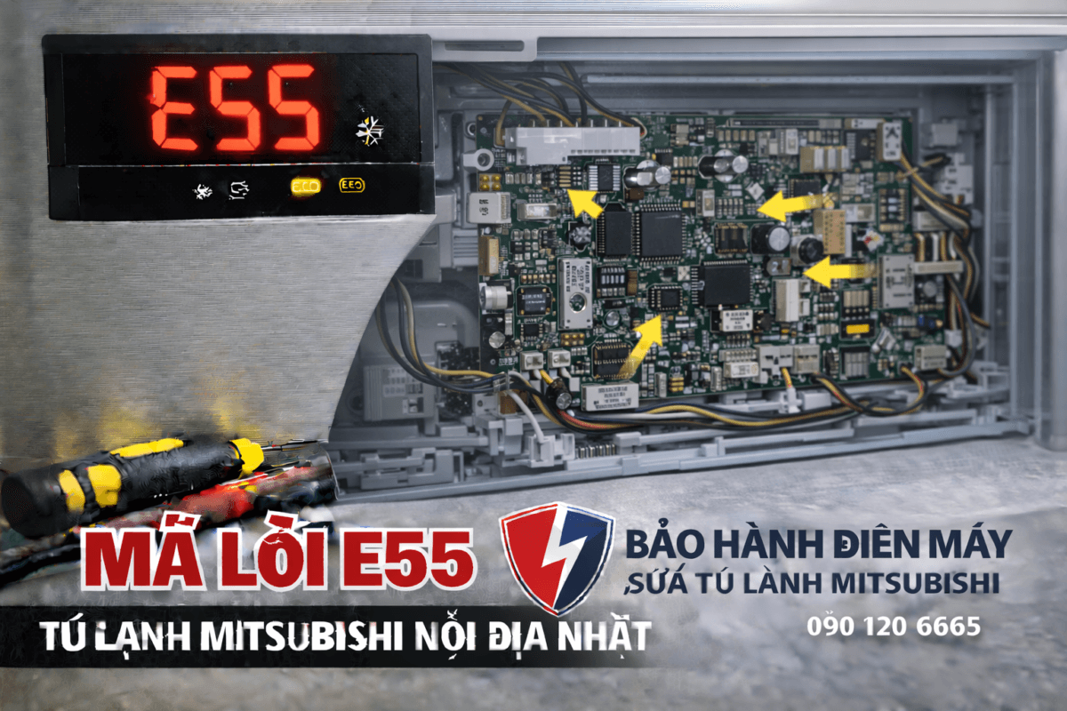 Dịch vụ Sửa tủ lạnh Mitsubishi nội địa Nhật của BẢO HÀNH ĐIỆN MÁY – 090.120.6665 chuyên xử lý triệt để lỗi E55 tại Hà Nội & TP.HCM, phục hồi bo mạch điều khiển đúng chuẩn Mitsubishi.